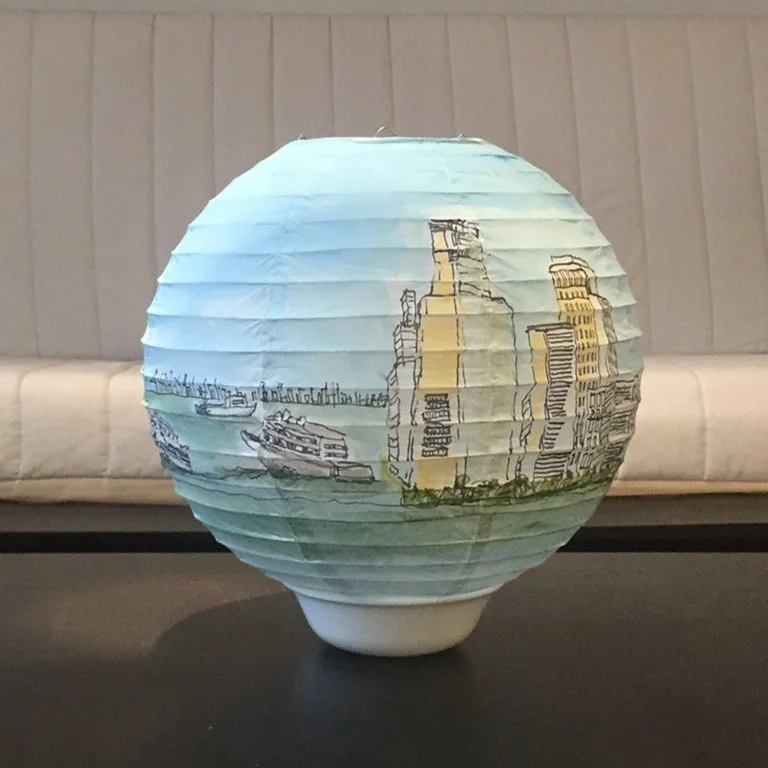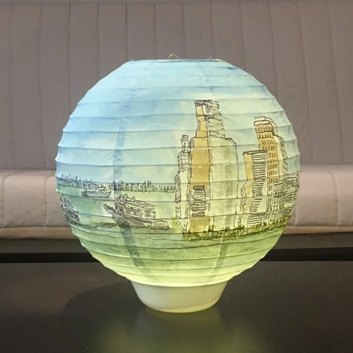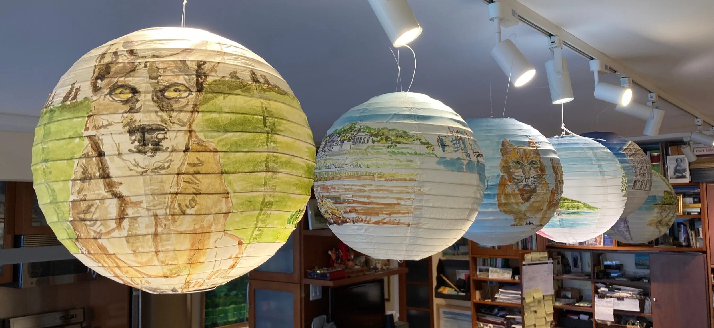 Art Lampoons are rice paper lanterns (choochin), painted with watercolor, gouache, pen and glycerin. The lampoons may be hung and lit internally with LEDs. They are easy to collapse for shipping or moving.